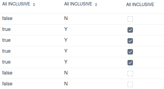 Die erste Variante liefer true/false. Die zweite Variante prüft mit einer if Abfrage und liefert “Y”/“N”. Die dritte Variante liefert eine CheckBox. Diese Variante ist nicht sortierbar!
